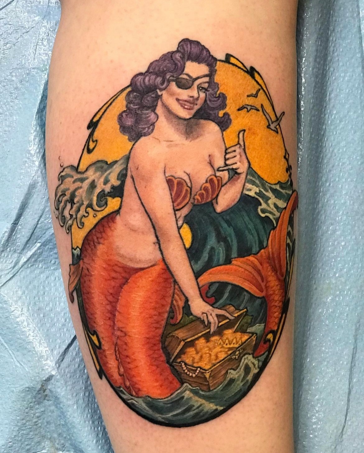 Jose Menendez: A seasoned artist at Studio City Tattoo with examples of pirate mermaid tattoos and years of expertise in themed designs.